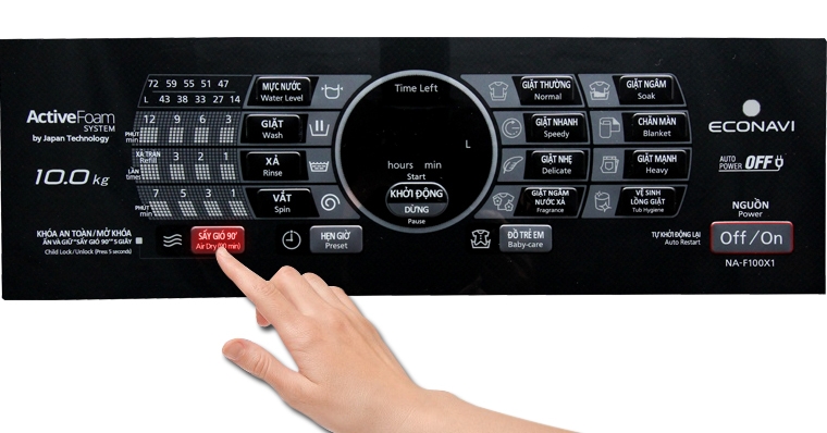 Máy giặt Panasonic NA- F90X1LRV với chế độ làm khô quần áo trong vòng 90 phút gió . Giúp quần áo khô tự nhiên hơn , không làm hỏng quần áo .