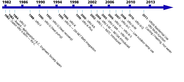 VRV Daikin đã đi một chặng đường dài kể từ khi nó ra đời vào năm 1982, nhờ liên tục, đầu tư liên tục của Daikin trong công nghệ và nghiên cứu và phát triển. Dưới đây là một ảnh chụp nhanh của các cải tiến hiệu suất, hiệu quả và giao diện chúng tôi đã đạt được trong 30 năm qua.
