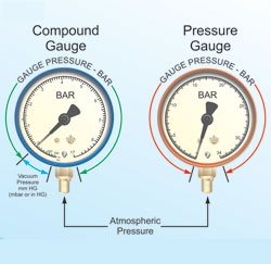 Một máy đo áp suất thông thường đọc những áp lực tích cực của một chất khí hoặc chất lỏng trên áp suất khí quyển. Một thước đo hợp chất có khả năng để chỉ cả hai áp lực dương và áp lực tiêu cực được tạo ra bởi áp lực chân không (xem hình 4).