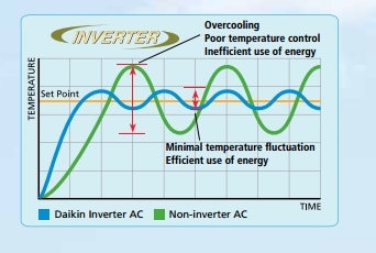 Hệ thống Daikin Inverter ngầm hoá không duy trì nhiệt độ cài đặt bằng cách đột ngột dừng lại và bắt đầu. Daikin công nghệ biến tần nghi liên tục cho phép họ bắt đầu nhẹ nhàng và duy trì các điểm đặt bằng cách thay đổi tốc độ