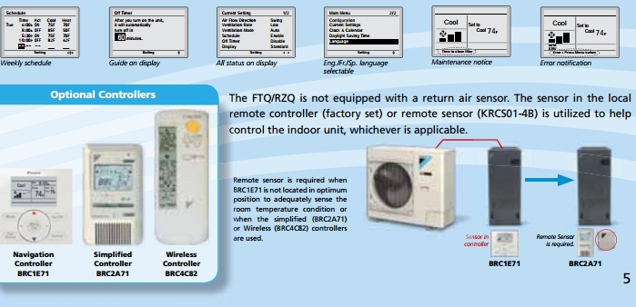 Các Navigation điều khiển từ xa là sự bổ sung mới nhất cho điều khiển bộ Daikin, nơi có kiến trúc điều khiển mở rộng tối ưu hóa cho công nghệ của chúng tôi. Các bộ điều khiển gắn trên tường có màn hình LCD backlit cũng như các menu trực quan. Thực đơn màn hình đang có sẵn trong tiếng Anh, tiếng Pháp hoặc tiếng Tây Ban Nha.