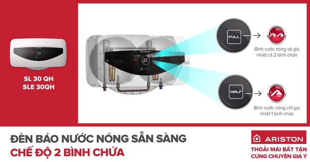 Ngoài ra, với công nghệ đặc biệt 2 bình chứa tiết kiệm điện tích hợp trong dòng máy nước nóng Slim 30 (SL30 QH và SL20), đèn báo nước nóng được phát triển thành đèn báo kép lần lượt hiển thị thời điểm nước nóng sẵn sàng ở mỗi bình chứa.