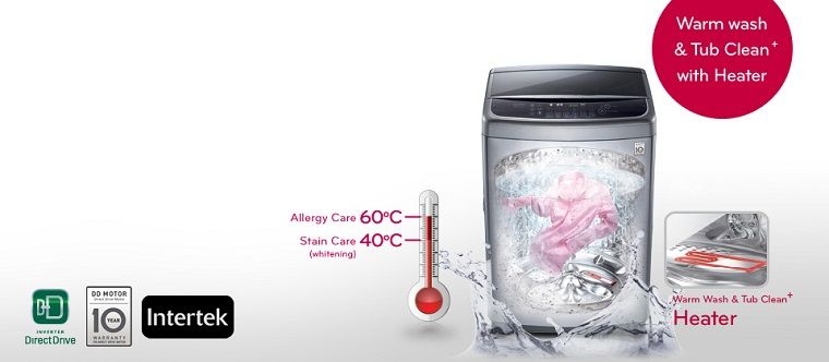 Ngoài ra phía dưới lồng giặt lồng đứng được đặt bộ gia nhiệt đặt giúp đun sôi nước tới 400C – 600C loại bỏ các tác nhân gây dị ứng, nấm mốc , khử trùng cũng như các vết bẩn cứng đầu .