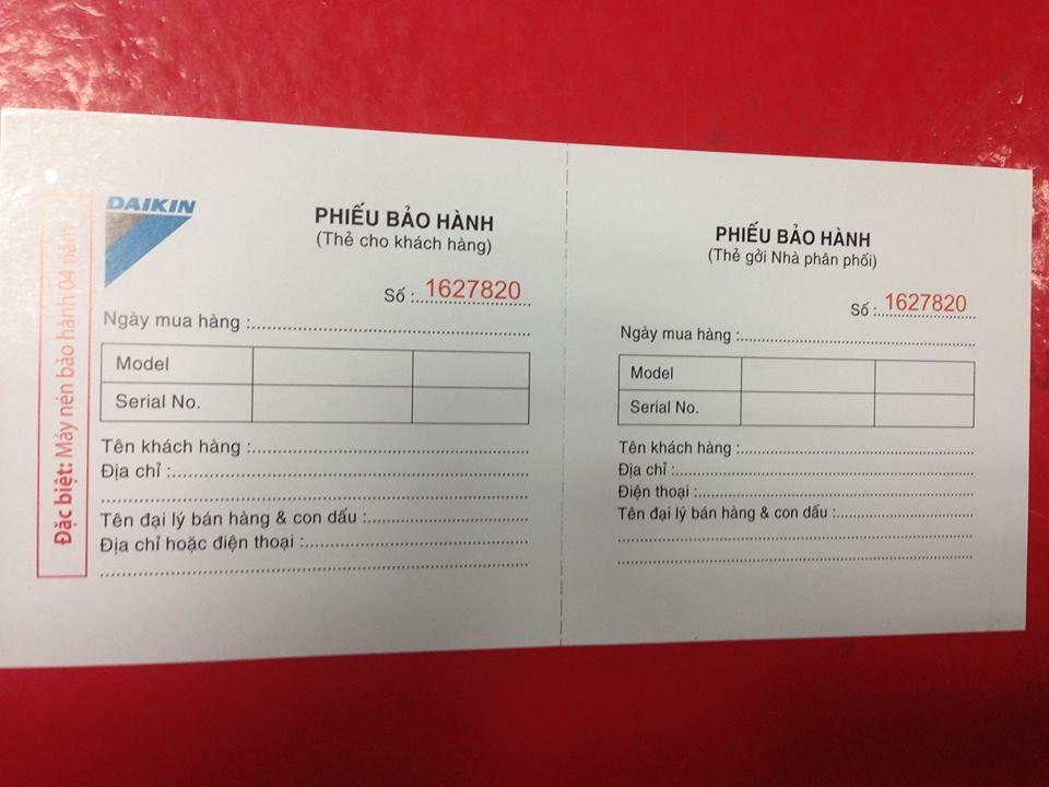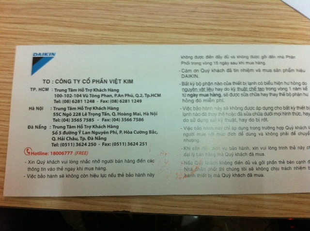 Trong thời gian trước, bất kì khách hàng nào khi mua máy của điều hòa Daikin chính hãng thì đều có con dấu của công ty cổ phần Việt Kim đóng ở giữa hai phần của phiếu bảo hành trong đó có 1 nửa dành cho nhà phân phối và 2 nửa dành cho khách hàng.