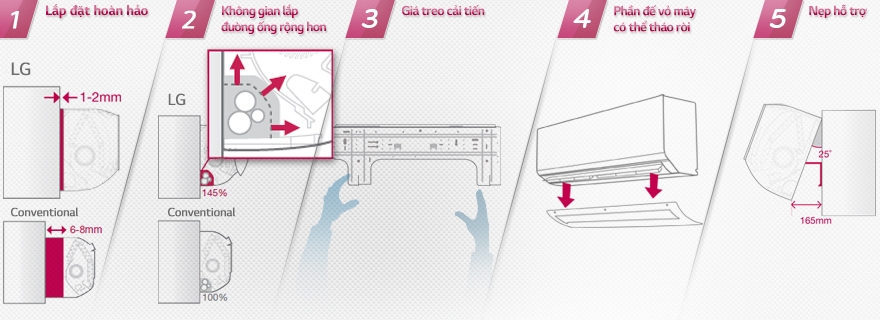 Điều hòa không khí LG được thiết kế để dễ dàng và hiệu quả hơn cho quá trình cài đặt, không phụ thuộc vào điều kiện xung quanh và số lượng nhân viên lắp đặt. Bằng việc giảm thời gian và số lượng kỹ thuật viên thao tác, giờ đây tốc độ lắp máy đã dễ dàng & nhanh hơn.