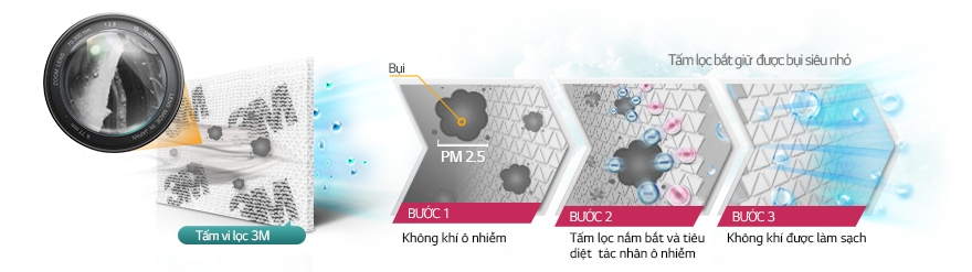 Công nghệ tiên tiến kết hợp giữa LG và 3M giúp tấm lọc loại bỏ các phần tử độc hại vi mô, bao gồm virus, vi khuẩn và chất gây dị ứng để cung cấp một môi trường an toàn, lành mạnh.